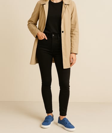 Se você deseja um visual mais esportivo, experimente usar o tênis azul com calça jeans azul ou preta com uma regata no tom neutro e uma jaqueta esportiva de sua preferência . A leveza e o caimento desses itens, aliados ao conforto do tênis, criam um contraste interessante e moderno. Uma saia midi em uma cor neutra, por exemplo, ganha um toque contemporâneo e casual quando combinada com esse calçado. O mesmo vale para vestidos, que ao serem complementados com o tênis, tornam-se mais acessíveis e práticos para o dia a dia.